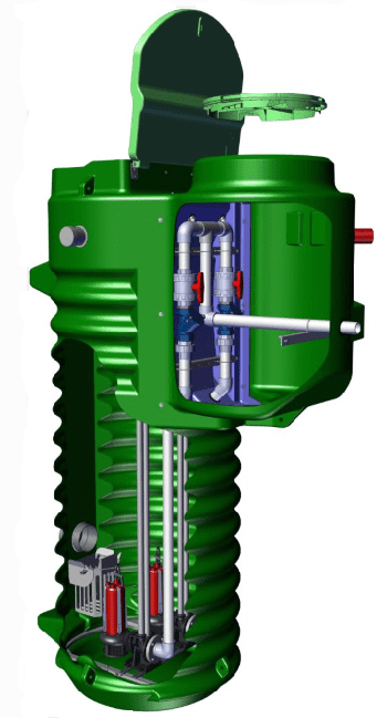 - Regard de vannage intégré à la cuve, indépendant du local de pompage pour des raisons d'hygiène et de sécurité.